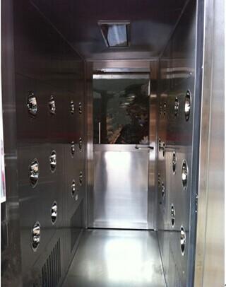 根據車間的人數,定制風淋室的長度,一般100人左右的企業適合多人雙吹風淋室。一次通過3人